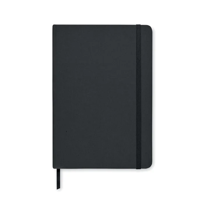 Блокнот формата A5 с твердой обложкой из переработанного картона. В переплете. 160 линованных страниц из каменной бумаги (80 листов). Эластичный хлястик и ленточный маркер страниц.