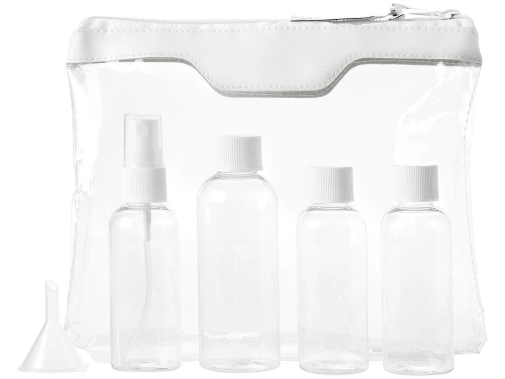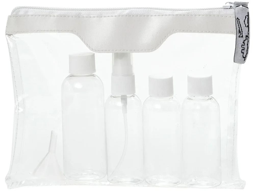 Одобренный дорожный набор бутылок для полетов Munich. Сумка для туалетных принадлежностей, которую можно брать в самолет. Включает 2 бутылки по 50 мл, 1 бутылку на 90 мл, 1 пульверизатор и воронку. Бутылки, пульверизатор и воронка упакованы в полиэтиленовый кулек отдельно от чехла. ПВХ.